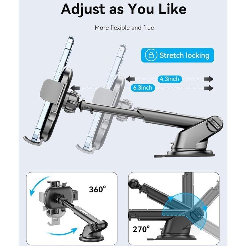 Personaliza tu experiencia de conducción con el brazo telescópico mejorado del soporte para teléfono VENTION. Se extiende de 11 a 16 cm y gira 270 grados para que puedas colocar tu teléfono en el ángulo perfecto y evitar que obstruya tu vista mientras conduces.