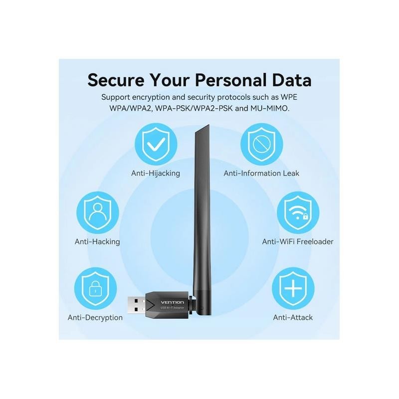 Adaptador USB Wi-Fi Vention KDUB0 de alta velocidad con configuración fácil, seguridad avanzada y señal fuerte para una conexión inalámbrica estable y rápida.