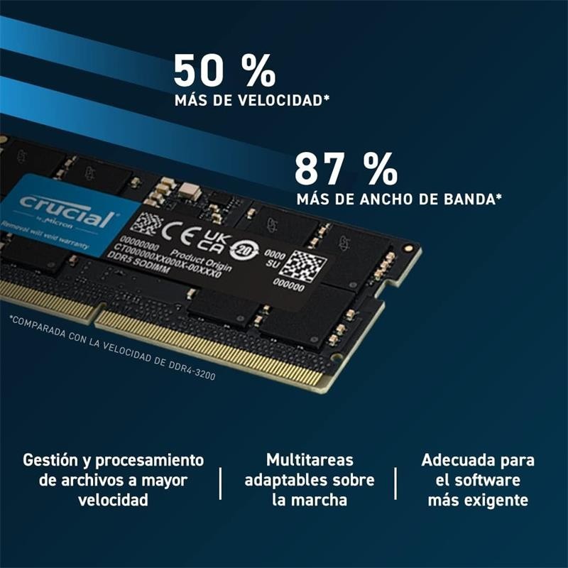 - Capacidad de respuesta multitarea sobre la marcha: Las memorias Crucial DDR5 ofrecen velocidades un 50% más rápidas que las DDR4 en su lanzamiento, lo que permite a los usuarios de ordenadores portátiles obtener un rendimiento extremo desde el primer momento. Y algo todavía más impresionante: las memorias Crucial DDR5 para ordenadores portátiles están optimizadas para mejorar el rendimiento y la capacidad multitarea, no solo durante las pruebas, sino también en condiciones reales. Ahora, abrir más pestañas de navegador y cambiar entre aplicaciones le resultará más fluido que nunca.
