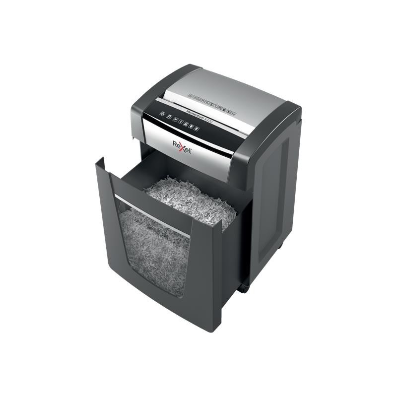 ¡La potencia para destruir más! La destructora de papel Rexel Momentum X420 destruye hasta 20 hojas de una vez, funciona ininterrumpidamente durante 4 horas y es ideal para oficinas pequeñas. La tecnología antiatasco del modelo X420 garantiza el funcionamiento ininterrumpido. P4, corte cruzado (partículas de 4 × 40 mm). Trituradora silenciosa con botones táctiles sencillos e intuitivos y una generosa papelera de 30 litros de capacidad (275 hojas A4).