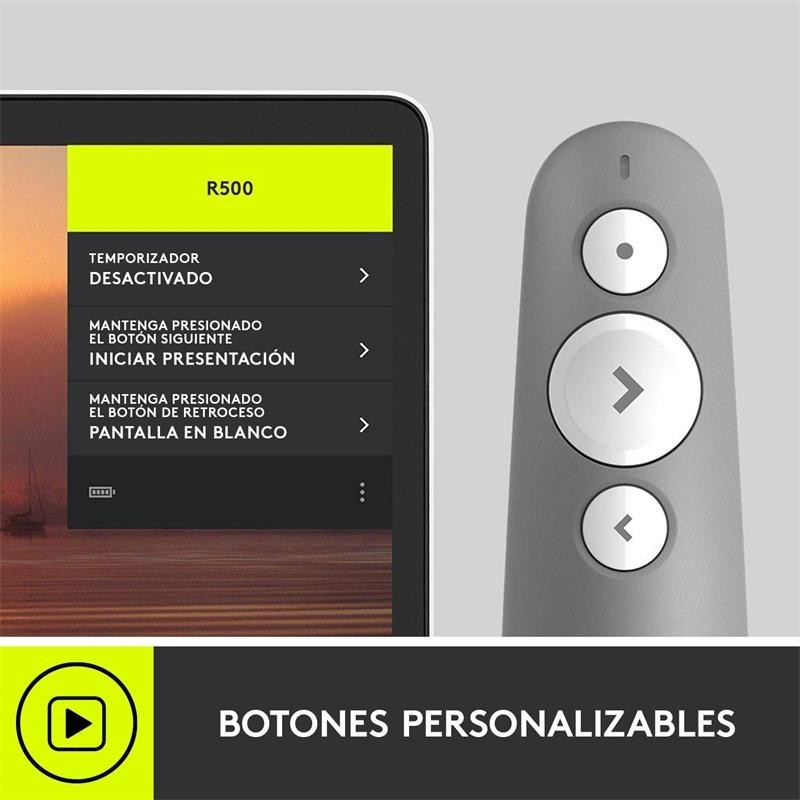 - Aplicación Logitech Presentation: Personalice las funciones de botones, controle la duración de las pilas y configure un temporizador en pantalla desde la aplicación Logitech Presentation. No tema que el ordenador entre en estado de suspensión, la aplicación lo mantiene activo mientras realiza la presentación. *Sólo disponible al instalar software en Mac y PC. Requiere la instalación del software Logitech Presentation (sólo compatible con Windows 7 o posteriores / macOS X 10.12 o posteriores).
