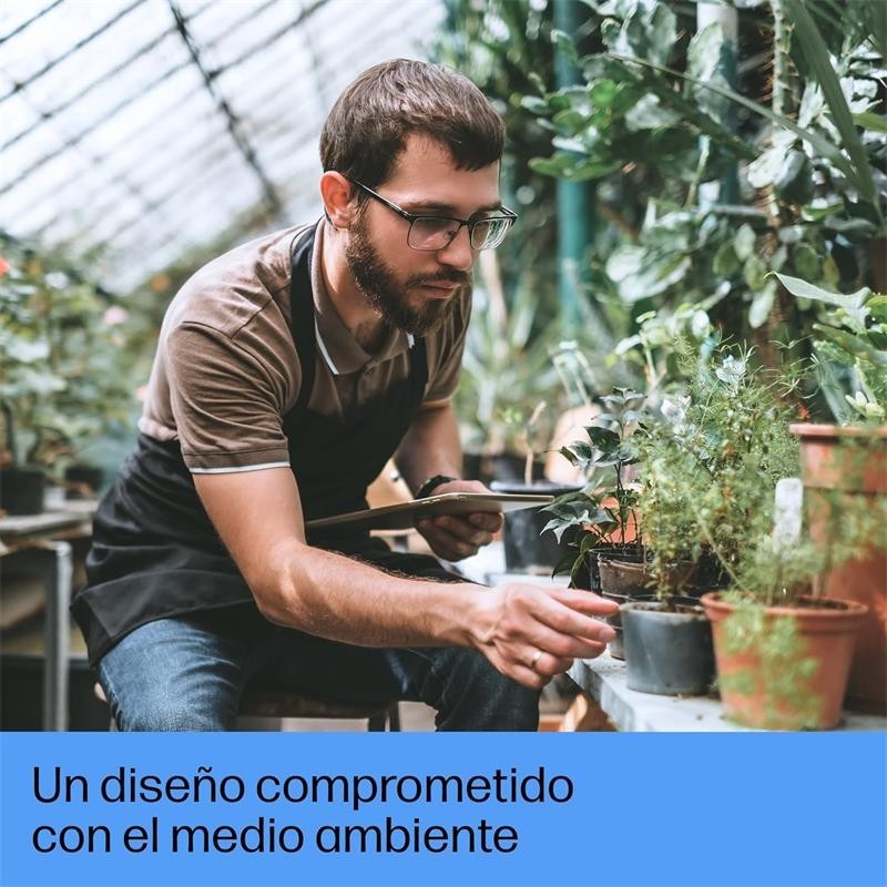 - Materiales y tecnologías sostenibles: Producto de impresión sostenible con HP+; Reciclable a través de HP Planet Partners; Compatible con los accesorios de accesibilidad; Contiene plástico reciclado posconsumo
